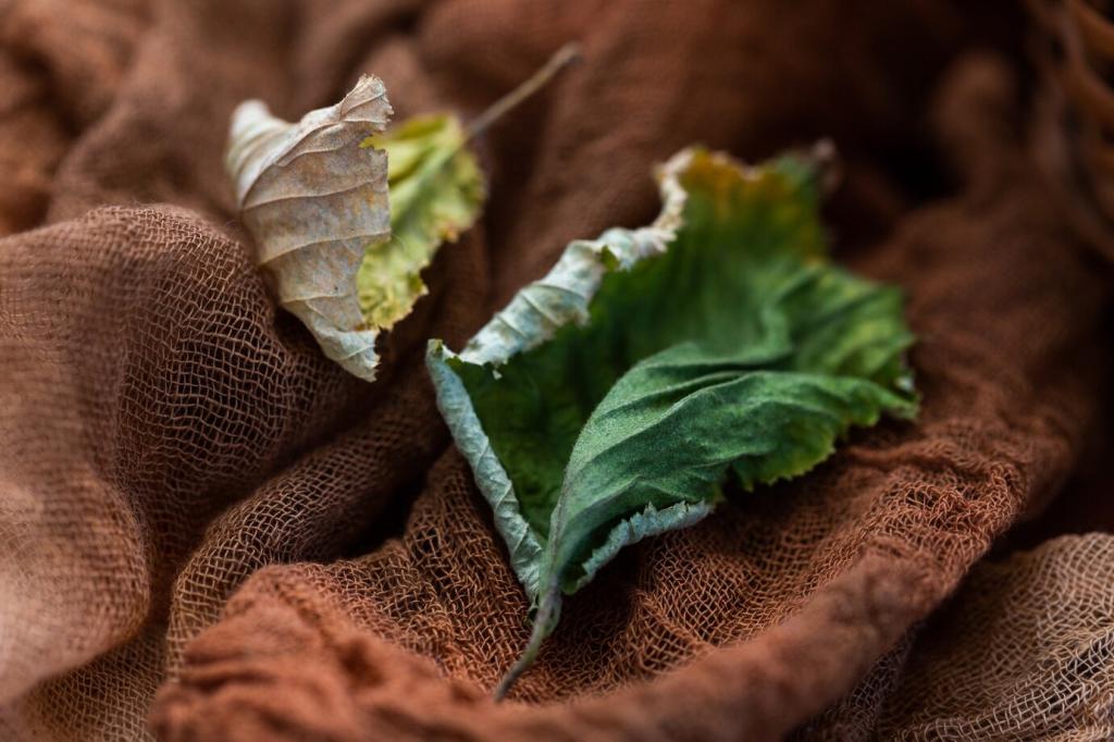 Zwiebelschalen, Indigo oder Krappwurzel liefern warme, lebendige Töne ohne aggressive Chemie. Meine Großmutter färbte einst Garn mit Walnussschalen, und der Schal duftete nach Herbst. Hast du schon experimentiert? Teile Rezepte, Bilder und Tipps, damit wir gemeinsam eine kleine Farbwerkstatt aufbauen.